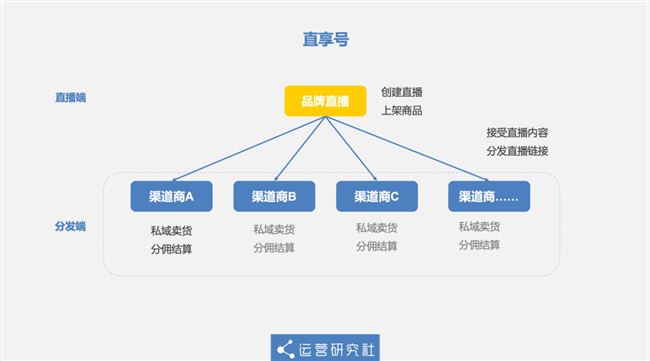 另一端,是分發(fā)端。渠道商可以用分發(fā)端去接受品牌商的直播內(nèi)容和商品,在自己的私域流量進(jìn)行賣貨,并獲得分傭結(jié)算。