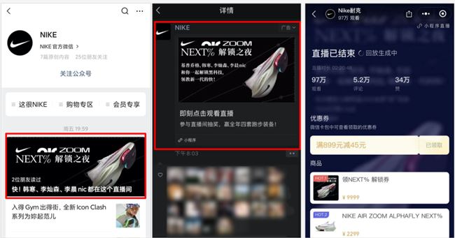 比如,Nike 就通過自有公眾號(hào)、小程序和社群激活私域流量池,同時(shí)在朋友圈、騰訊視頻、QQ音樂等平臺(tái)投放,最終小程序直播觀看人次達(dá)到近 100 萬。