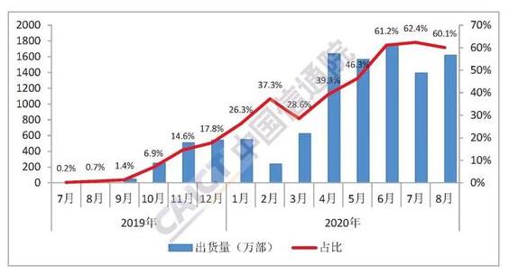 5G手機(jī)方面,2020 年 8 月,國內(nèi)市場 5G 手機(jī)出貨量 1617.0 萬部,占同期手機(jī)出貨量的 60.1%;上市新機(jī)型 22 款,占同期手機(jī)上市新機(jī)型數(shù)量的 48.9%。1-8 月,國內(nèi)市場 5G 手機(jī)累計(jì)出貨量 9367.9 萬部、上市新機(jī)型累計(jì) 141 款,占比分別為 46.3% 和 46.8%。