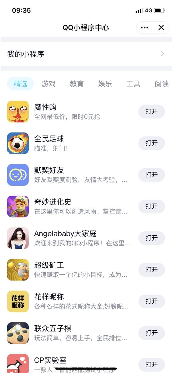 點(diǎn)擊最右側(cè)的“更多”,便可進(jìn)入“QQ小程序中心”,除了頂部的“我的小程序”外,下方則類似于應(yīng)用商店,方便使用者挑選QQ小程序。