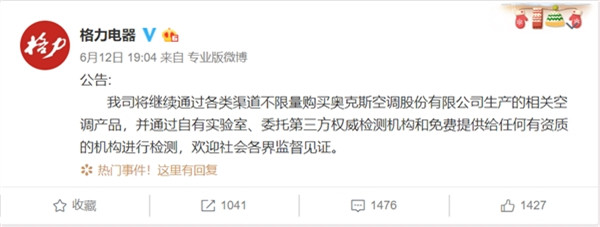 就在昨天,格力電器官方微博發(fā)布最新公告,表示繼續(xù)通過(guò)各類(lèi)渠道不限量購(gòu)買(mǎi)奧克斯空調(diào)股份有限公司生產(chǎn)的相關(guān)空調(diào)產(chǎn)品,并通過(guò)自有實(shí)驗(yàn)室、委托第三方權(quán)威檢測(cè)機(jī)構(gòu)和免費(fèi)提供給任何有資質(zhì)的機(jī)構(gòu)進(jìn)行檢測(cè),歡迎社會(huì)各界監(jiān)督見(jiàn)證。